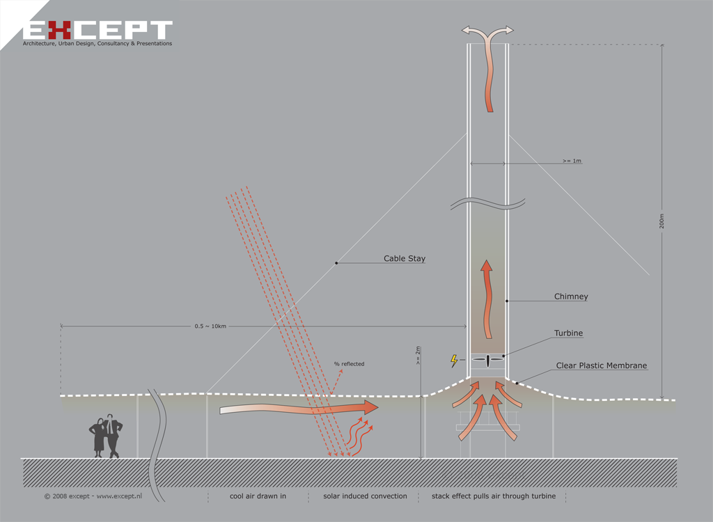 tower is a proposed type of renewable-energy power plant. Air is heated in a