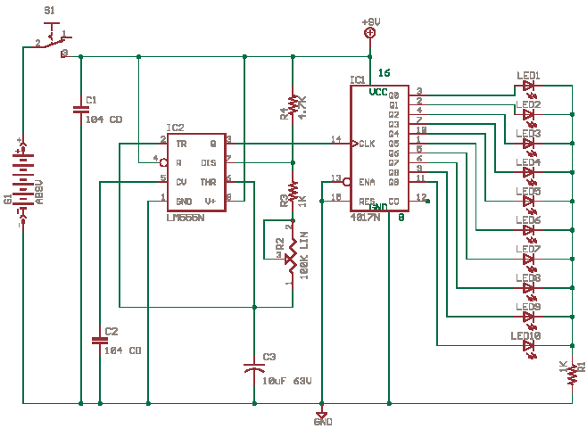 Flashing 13 LED unit, 3V supply, 7555 or TS555CN CMos Timer IC |