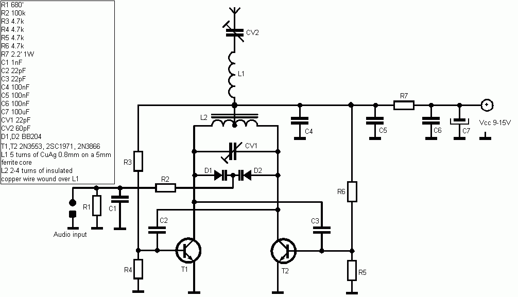 transmitter FM transmitter circuit, power output 200-250 milliwatts,