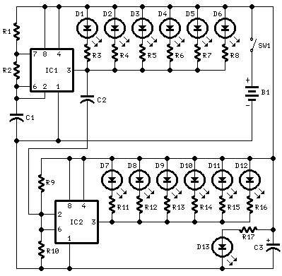 This circuit is powered by a 9 volt battery, suitable for warning lights on a