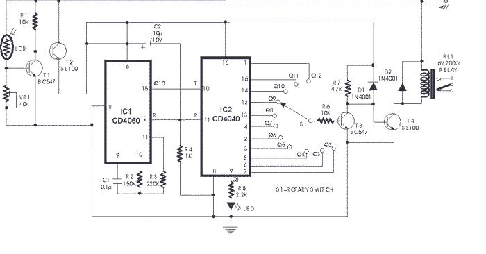 detection circuit LDR, photocells, Variable resistor R1 adjusts the light