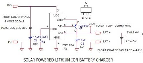 and voltage to a 3.6v lithium ion battery. The current is limited to 300ma and